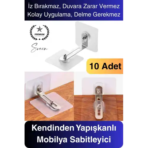 Kolay montaj imkanı sunan kendinden yapışkanlı tasarım, ekstra delme işlemleri gerektirmez ve mobilyalarınızı hızlıca sabitlemenizi sağlar.; ; Deprem güvenliği için ideal bir çözüm olan bu set, dolap ve raflarınızın sallanmasını önleyerek güvenli bir kullanım sunar.; ; 10 adet mobilya sabitleme seti ile evinizdeki mobilyaların stabilitesini artırarak güvenli bir yaşam alanı yaratabilirsiniz.; ; Kalite standartlarına uygun olarak tasarlanmış olup uzun ömürlü kullanım vaat eder.; ; Duvar kağıdı ve alçılı yüzeylerde tavsiye edilmez.; ; Duvarınıza hiçbir şekilde zarar vermez, iz bırakmaz.; ; Kontrolleri yapıldıktan sonra özenle paketlenerek en hızlı şekilde gönderilmektedir.; ;