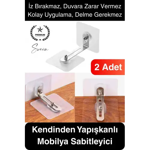 Kolay montaj imkanı sunan kendinden yapışkanlı tasarım, ekstra delme işlemleri gerektirmez ve mobilyalarınızı hızlıca sabitlemenizi sağlar.; ; Deprem güvenliği için ideal bir çözüm olan bu set, dolap ve raflarınızın sallanmasını önleyerek güvenli bir kullanım sunar.; ; 2 adet mobilya sabitleme seti ile evinizdeki mobilyaların stabilitesini artırarak güvenli bir yaşam alanı yaratabilirsiniz.; ; Kalite standartlarına uygun olarak tasarlanmış olup uzun ömürlü kullanım vaat eder.; ; Duvar kağıdı ve alçılı yüzeylerde tavsiye edilmez.; ; Duvarınıza hiçbir şekilde zarar vermez, iz bırakmaz.; ; Kontrolleri yapıldıktan sonra özenle paketlenerek en hızlı şekilde gönderilmektedir.; ;