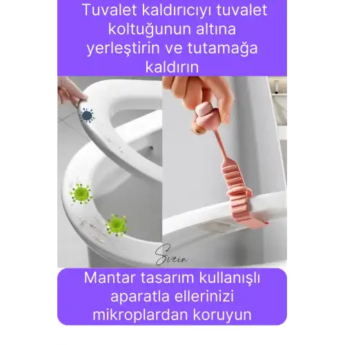 Mantar tasarım kullanışlı aparatla ellerinizi mikroplardan koruyun. ; Tuvalet kaldırıcıyı tuvalet koltuğunun altına yerleştirin ve tutamağa kaldırın. ; Herhangi bir klozet veya kapağa uyar esnek yapıya sahiptir, kullanımı çok kolaydır. ; Boyutları: 24 x 2.4 cm;