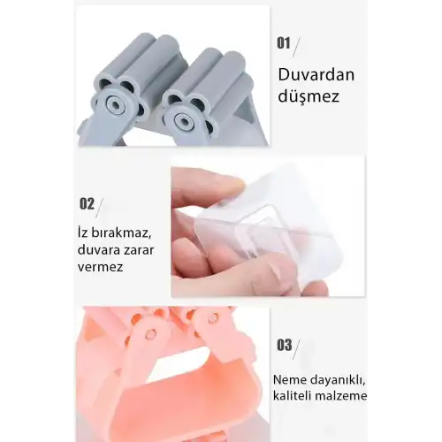 Güçlü yapışkan özelliği sayesinde mop ve paspaslarınızı duvara kolayca monte edebilirsiniz.; ; İz bırakmayan yapısı ile temiz bir görünüm sağlar ve duvarlarınıza zarar vermez.; ; Birçok mop veya paspasınız için idealdir.; ; Paket içeriği 4 adettir.; ; Kontrolleri yapıldıktan sonra özenle paketlenerek en hızlı şekilde gönderilmektedir.; ;