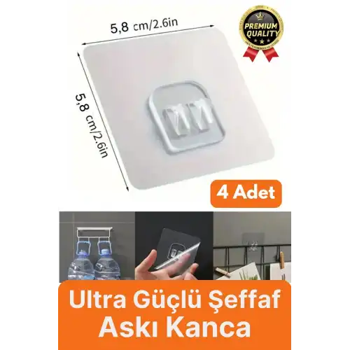 4 Adet Ultra Güçlü Suya Dayanıklı Şeffaf Askı Kanca, evinizin düzenini kolaylıkla sağlamanız için tasarlandı. Mutfak, banyo, salon veya ofis fark etmeksizin, her ortamda eşyalarınızı pratik ve estetik biçimde sabitlemenize yardımcı olur.