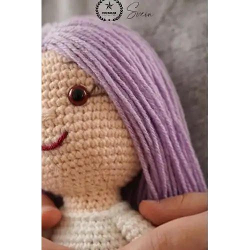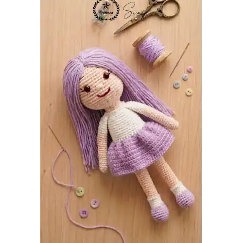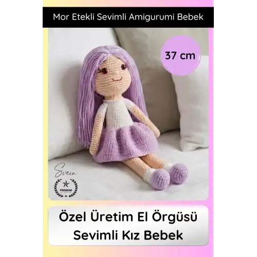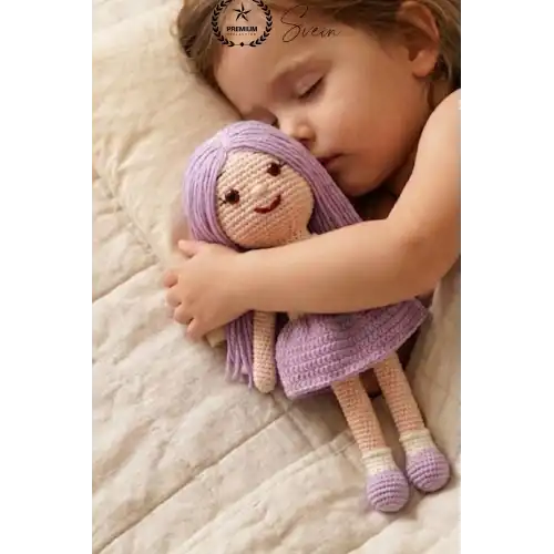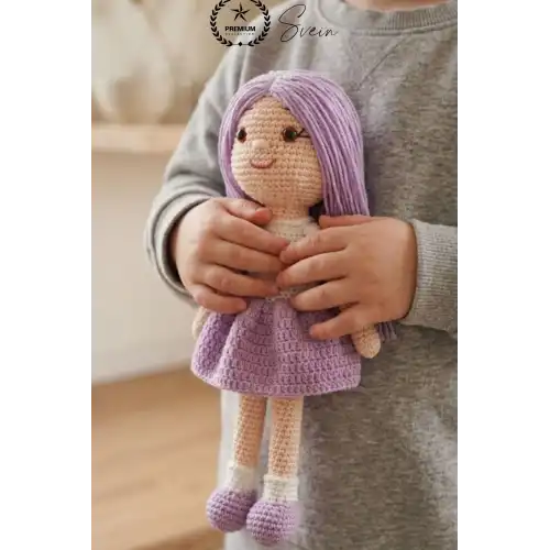 El emeği ile özenle hazırlanan bu amigurumi bebek, sevimli tasarımı ve mor etek detayı ile hem çocuklar hem de dekor severler için özel bir üründür. Her biri benzersiz olan bu el örgüsü oyuncak, sıcak ve samimi bir hediye alternatifi sunar.