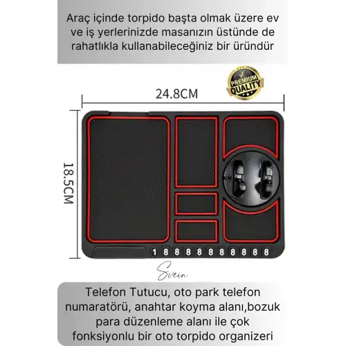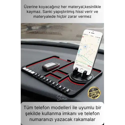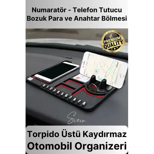 Telefon Tutucu, oto park telefon numaratörü, anahtar koyma alanı,bozuk para düzenleme alanı ile çok fonksiyonlu bir oto torpido organizeri. ; Araç içinde torpido başta olmak üzere ev ve iş yerlerinizde masanızın üstünde de rahatlıkla kullanabileceğiniz bir üründür. ; Telefon numaranızı yazamanızı sağlayıcı tasarım. ; Tüm telefon modelleri ile uyumlu bir şekilde kullanma imkanı ve telefon numaranızı yazacak rakamalar. ; Kaydırmaz özelliği sayesinde eşyalarınız için kolayca kullanabilirsiniz. Telefon,anahtarlık,ruhsat,cüzdan için kullanabilirsiniz. ; Kaydırmaz çift taraflı yapısıyla,hiçbir montaja gerek kalmadan direk uygulama ile Torpido üzerinde kaydırmazlık görevine başlar. ; Paket İçeriği: 1 Adet Çok Fonksiyonlu Araç İçi Telefon Tutucu organizer, çift taraflı bant ve telefon numarası için her rakamdan 6 adet rakam. ; Kontrolleri yapıldıktan sonra özenle paketlenerek sorunsuz bir şekilde gönderilmektedir. ;