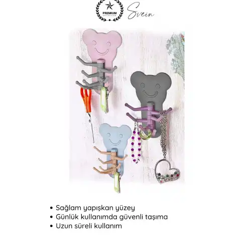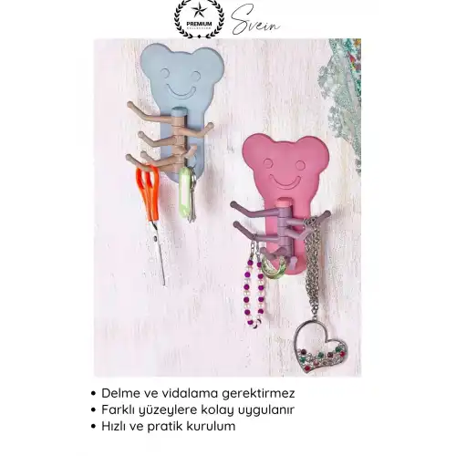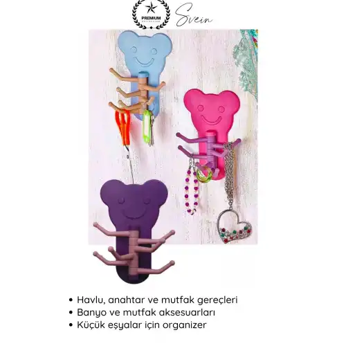 Yaşam alanlarınıza hem düzen hem de dekoratif bir dokunuş kazandıran ayıcık şekilli yapışkanlı duvar askısı; pratik kullanımı ve sevimli tasarımı ile mutfak, banyo ve oda düzeninde ideal bir çözümdür. Delme gerektirmeyen yapısı sayesinde kolayca uygulanır.