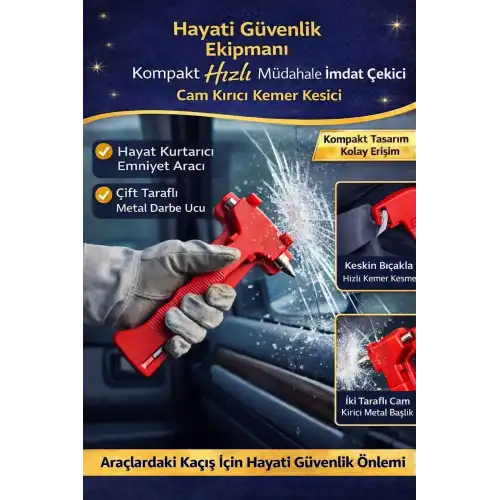 Trafikte yaşanabilecek beklenmedik durumlar saniyeler içinde kritik bir hâl alabilir. Araç Hayati Güvenlik Ekipmanı Kompakt Hızlı Müdahale İmdat Çekici Cam Kırıcı Kemer Kesici; kaza, suya düşme, yangın veya kapıların kilitlenmesi gibi acil durumlarda araçtan güvenli şekilde çıkabilmeniz için tasarlanmış çok amaçlı bir kurtarma aracıdır. Küçük boyutuna rağmen güçlü yapısıyla her araçta bulunması gereken temel güvenlik ekipmanları arasında yer alır.