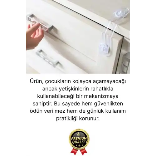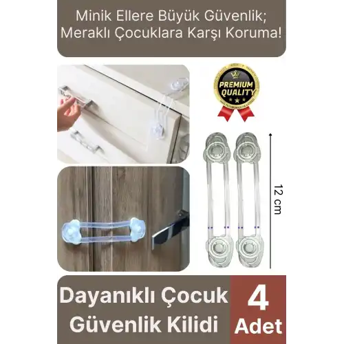 Paket içeriğinde bulunan 4 adet güvenlik kilidi, evin birden fazla noktasında aynı anda kullanım imkanı sunar. Özellikle mutfak, banyo ve çocuk odası gibi riskli alanlarda bütünsel bir güvenlik sağlar.