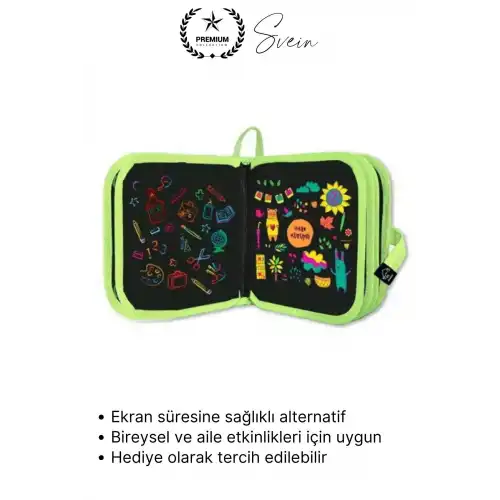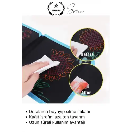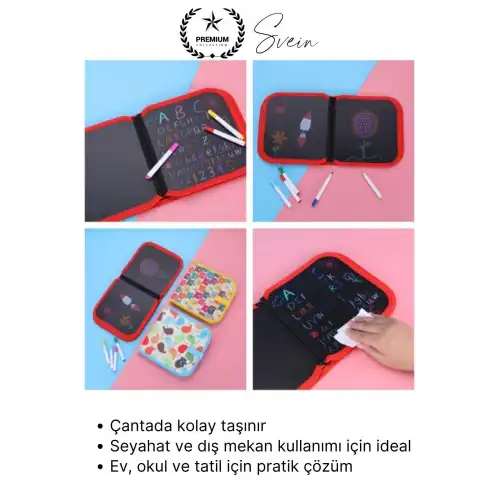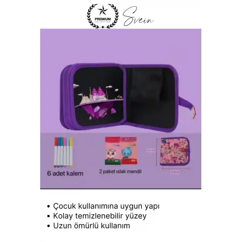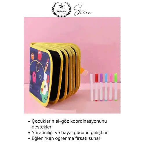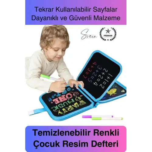 Çocukların hayal gücünü geliştiren, eğlenceli ve öğretici bir aktivite sunan temizlenebilir renkli resim defteri, silinebilen özel sayfaları sayesinde tekrar tekrar kullanılabilir. Hafif ve taşınabilir yapısı ile evde, okulda ve seyahatte rahatlıkla kullanılabilir. Hem eğitici hem de eğlenceli bir boyama deneyimi sunar.