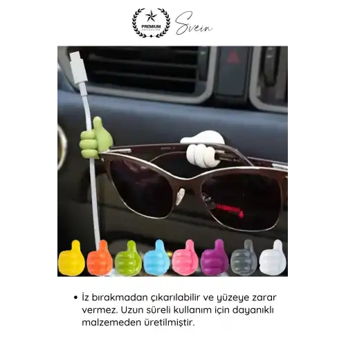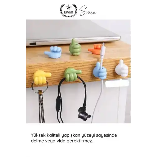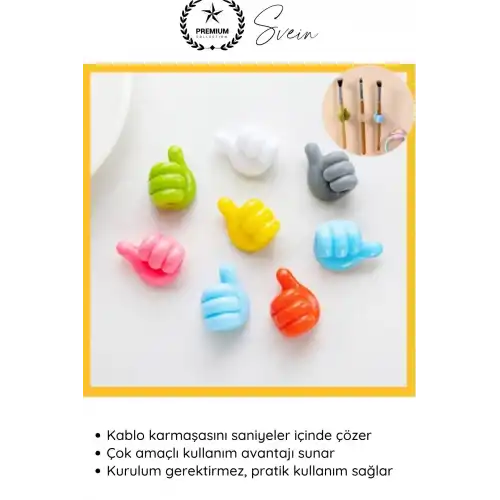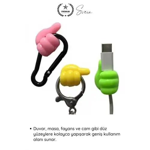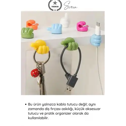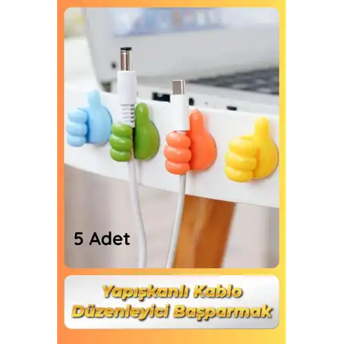 Renkli başparmak tasarımlı yapışkanlı kablo düzenleyici, masa üstü ve yaşam alanlarında oluşan kablo karmaşasını ortadan kaldırmak için geliştirilmiş çok amaçlı bir organizer aparatıdır. Hem fonksiyonel hem de dekoratif yapısı sayesinde ev, ofis ve banyo kullanımına uygundur.