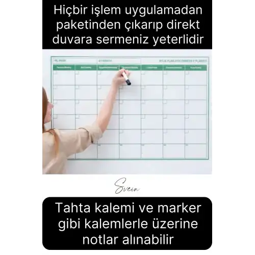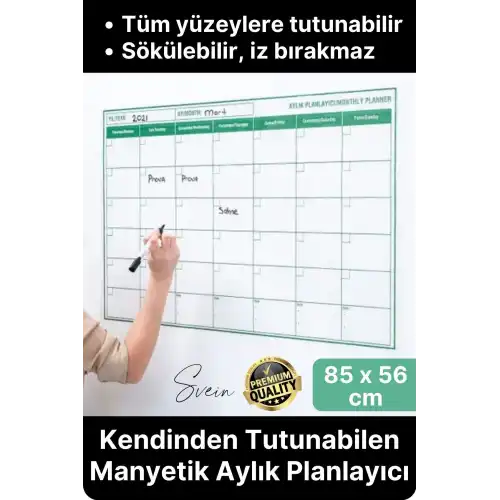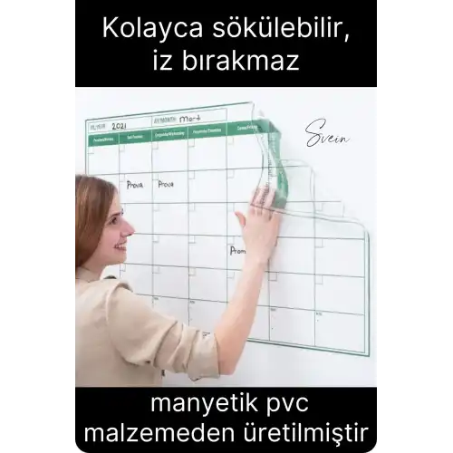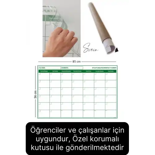 Ürün her düz zemine tutunabilen manyetik pvc malzemeden üretilmiştir. ; Herhangi bir yapışkanı yoktur, duvarda iz bırakmaz, zarar vermez. ; Hiçbir işlem uygulamadan paketinden çıkarıp direkt duvara sermeniz yeterlidir. ; Tahta kalemi ve marker gibi kalemlerle üzerine notlar alınabilir. ; Öğrenciler ve çalışanlar için uygundur. ; Bir aylık planlama yapılabilir. ; Ölçüleri: 85 x 56 cm ; Özel korumalı kutusu ile gönderilmektedir. ; Kontrolleri yapıldıktan sonra özenle paketlenerek sorunsuz bir şekilde gönderilmektedir. ;