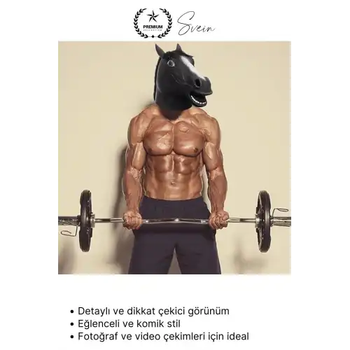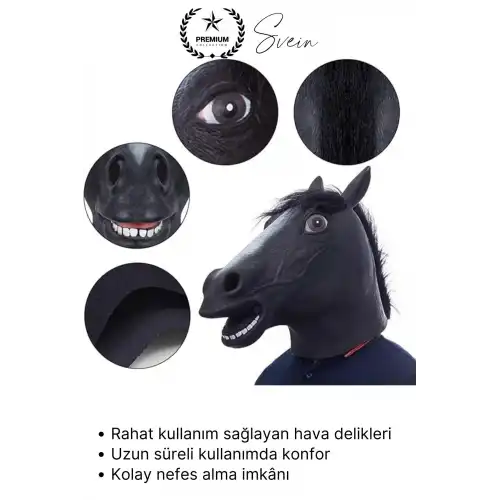 Partiler, maskeli balolar ve eğlenceli etkinlikler için tasarlanan gerçekçi siyah at kafası maskesi; dikkat çekici tasarımı ile ortamın en komik ve ilgi çekici kostümlerinden biri olmanızı sağlar. Tam kafa kaplayan yapısı ve nefes alabilen tasarımı sayesinde rahat kullanım sunar.