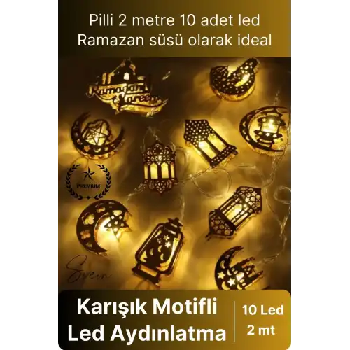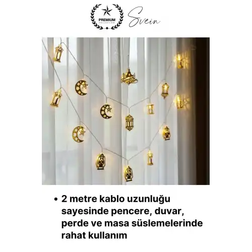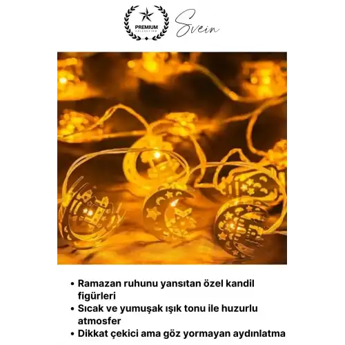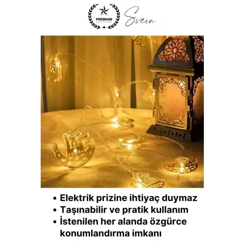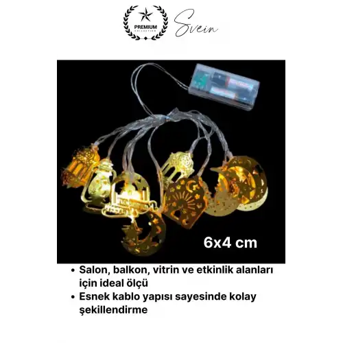 Ramazan ayına özel tasarlanan gold metal LED ışık serisi, karışık motifli şık detayları ve günışığı tonundaki aydınlatmasıyla yaşam alanlarınıza sıcak, zarif ve dikkat çekici bir atmosfer kazandırır. 2 metre uzunluğa sahip 10 LED’li yapısı sayesinde hem ev dekorasyonunda hem de özel gün süslemelerinde etkili bir kullanım sunar.
