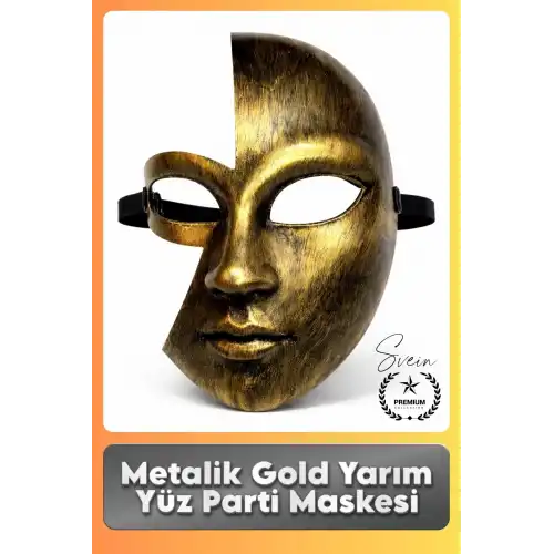Metalik gold yarım yüz parti maskesi ile maskeli balo ve eğlence etkinliklerinde şık, gizemli ve dikkat çekici bir görünüm elde edebilirsiniz. Kostüm kombinlerinizi tamamlayan zarif bir parti aksesuarıdır.