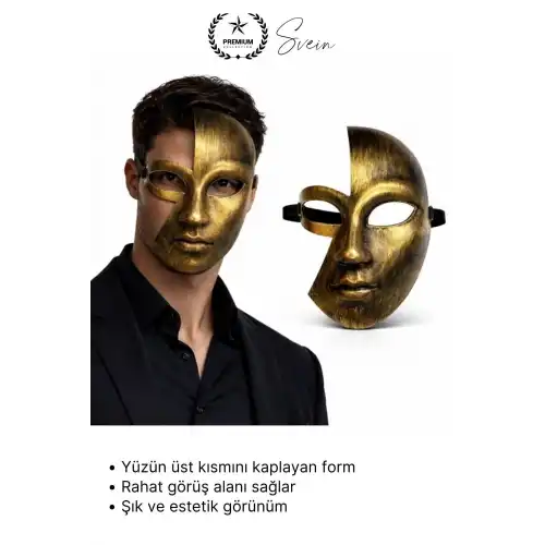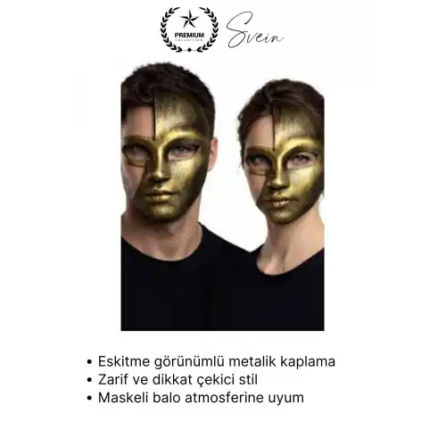 Maskeli balo, parti ve özel etkinliklerde dikkat çekici bir stil sunan metalik gold yarım yüz maskesi; antik eskitme efektli tasarımı ile şık ve gizemli bir görünüm oluşturur. Hafif yapısı sayesinde rahat kullanım sunan bu maske, kostüm ve parti kombinlerinin tamamlayıcı aksesuarıdır.