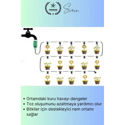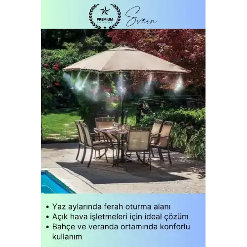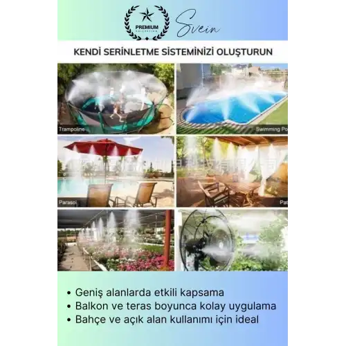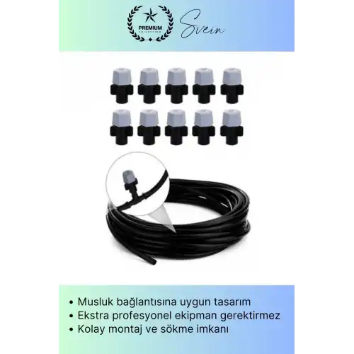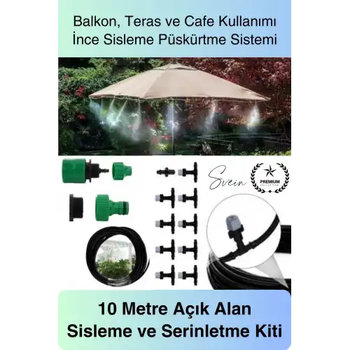 Balkon, teras, bahçe ve kafe gibi açık alanlarda yaz sıcaklarını düşürmek için tasarlanan 10 metre sisleme ve nemlendirme kiti, ince su püskürtme sistemi sayesinde serin ve ferah bir ortam oluşturur. Pratik kurulum yapısı ile kısa sürede hazır hale gelir ve geniş alanlarda etkili sunar.