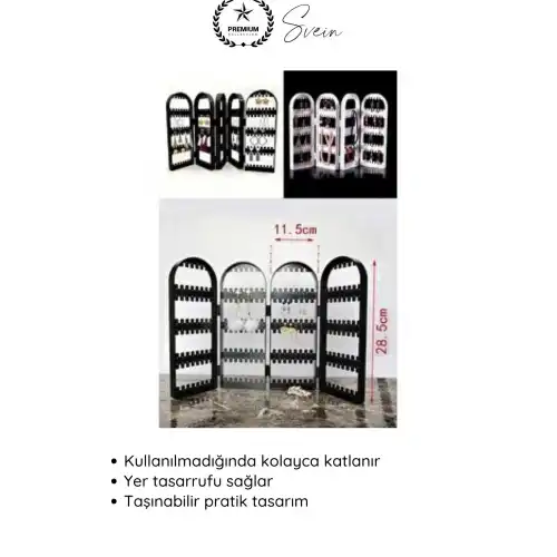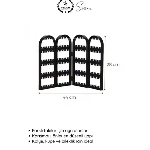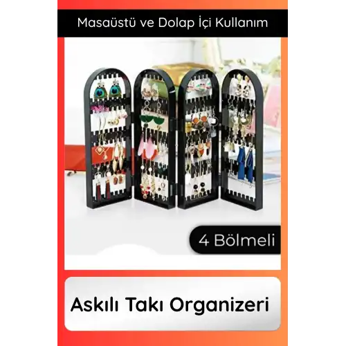 Kolye, küpe ve bilekliklerinizi düzenli şekilde saklamak için tasarlanan siyah askılı takı organizeri; 4 bölmeli yapısı sayesinde karışıklığı önler ve aksesuarlarınıza kolay erişim sağlar. Katlanabilir tasarımı ile yer tasarrufu sunan bu organizer, masaüstünde şık bir görünüm oluşturur.