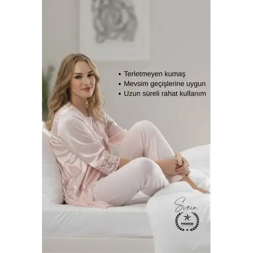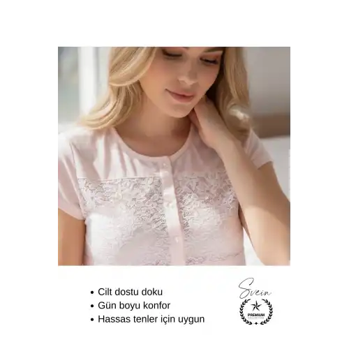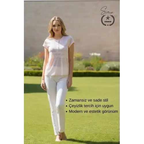 Günlük kullanım ve çeyizlik tercih için tasarlanan pudra penye kadın pijama takımı; nefes alabilen yapısı, yumuşak dokusu ve rahat kesimi ile gün boyu konfor sunar. Kısa kollu tasarımı sayesinde özellikle sıcak havalarda ideal bir ev giyim seçeneğidir.
