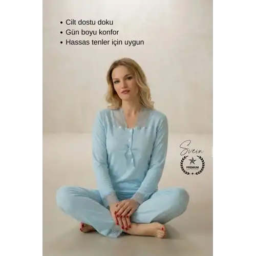 Günlük kullanım ve çeyizlik tercih için ideal olan Turkuaz Saten kadın pijama takımı; yumuşak dokusu, nefes alabilen kumaşı ve rahat kesimi ile konforu ön planda tutar. Zarif ve sade tasarımı sayesinde hem evde hem dinlenme anlarında şık bir görünüm sunar.
