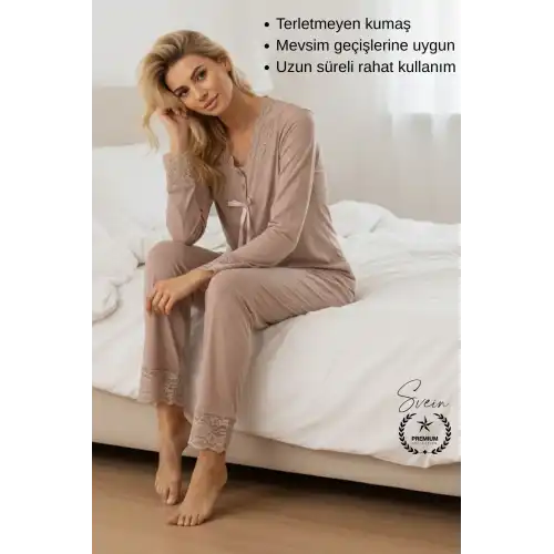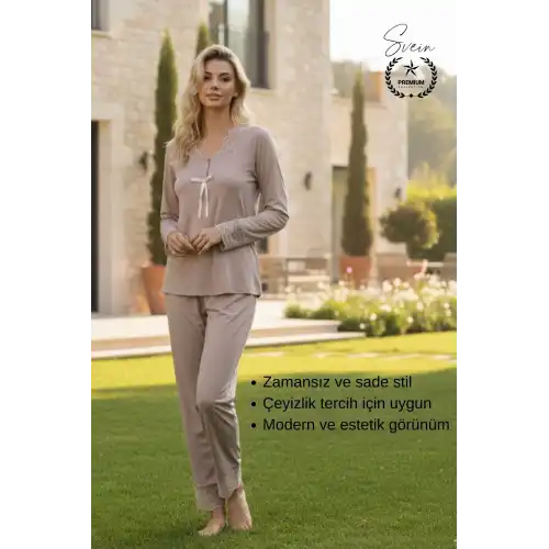 Günlük kullanım ve çeyizlik tercih için ideal olan vizon penye kadın pijama takımı; yumuşak dokusu, nefes alabilen kumaşı ve rahat kesimi ile konforu ön planda tutar. Zarif ve sade tasarımı sayesinde hem evde hem dinlenme anlarında şık bir görünüm sunar.