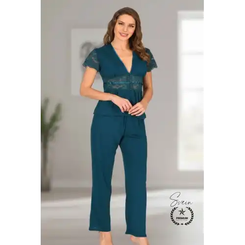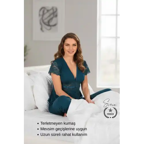 Günlük kullanım ve çeyizlik tercih için tasarlanan yeşil kadın pijama seti; yumuşak dokusu ve nefes alabilen kumaşı ile gün boyu konfor sağlar. Modern ve şık tasarımı sayesinde ev giyiminde hem rahat hem estetik bir görünüm sunar.