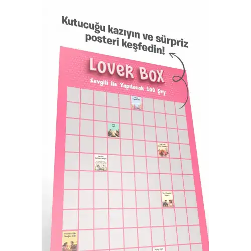 Poster üzerinde yer alan 100 farklı görev ve aktivite, ilişkinize renk katmak için özenle hazırlanmıştır. Her kazıdığınızda yeni bir sürprizle karşılaşır, birlikte keşfetmenin keyfini yaşarsınız. Küçük anları büyük hatıralara dönüştürmenin en keyifli yolu burada başlar.