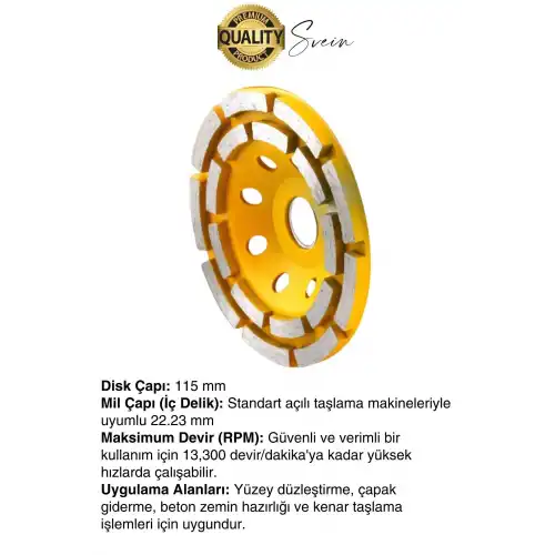 Beton Mermer Granit Taşlama Elmas Çanak Disk Yüzey Silme Temizleme Çift Sıra Segmanlı 115Teknik Özellikler