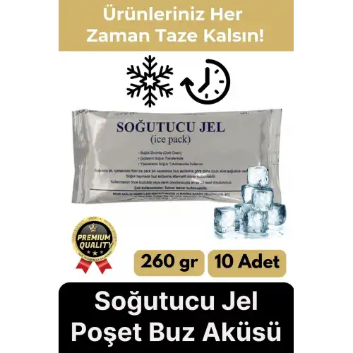 Bu 10 adet 260 gr Premium Soğutucu Jel Poşet Buz Aküsü, uzun süreli serinlik, güvenli kullanım ve dayanıklı yapısıyla yiyeceklerinizi her koşulda taze tutmak için en iyi seçiminizdir.