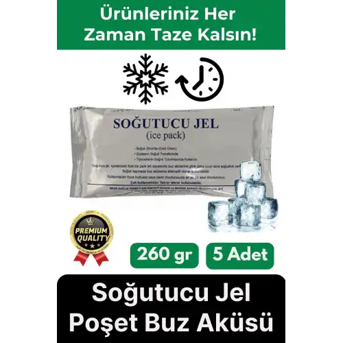 Bu 5 adetlik 260 gr Premium Soğutucu Jel Poşet Buz Aküsü, taşınabilirliği, dayanıklılığı ve güçlü soğutma performansıyla her ortamda yiyecek ve içeceklerinizi serin tutmanın en pratik yoludur.