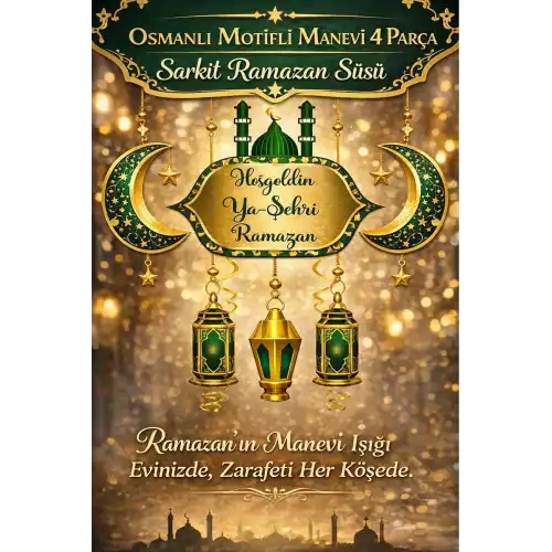 Osmanlı motifli Ramazan süsü, sarkıt Ramazan dekoru, Hoşgeldin Ya Şehri Ramazan yazılı pano, yeşil Ramazan süsü, 4 parça Ramazan seti gibi aramalarda öne çıkabilecek şekilde tasarlanmış ve kategorize edilmiştir. Hem görsel zenginliği hem anlamlı içeriği sayesinde dikkat çekici bir üründür.