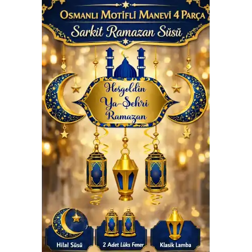Ürün; 1 adet “Hoşgeldin Ya Şehri Ramazan” yazılı ana pano, 2 adet lüks Osmanlı desenli fener sarkıt ve 1 adet klasik büyük lamba sarkıttan oluşur. Hilal ve yıldız detaylarıyla tamamlanan tasarım, bütünsel ve dengeli bir görünüm sunar. Tek başına duvar süsü olarak ya da vitrin, pencere, kapı arkası gibi alanlarda rahatlıkla kullanılabilir.