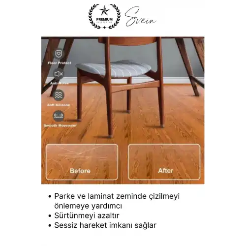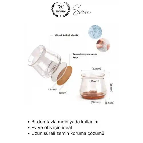 Parke, seramik ve fayans zeminlerde oluşan çizik, sürtünme izi ve rahatsız edici ses problemlerine pratik çözüm sunan keçeli şeffaf silikon zemin koruyucu, sandalye ve masa ayaklarına kolayca takılır. Esnek yapısı sayesinde farklı ayak tiplerine uyum sağlar, zemini korurken sessiz ve konforlu kullanım sunar.