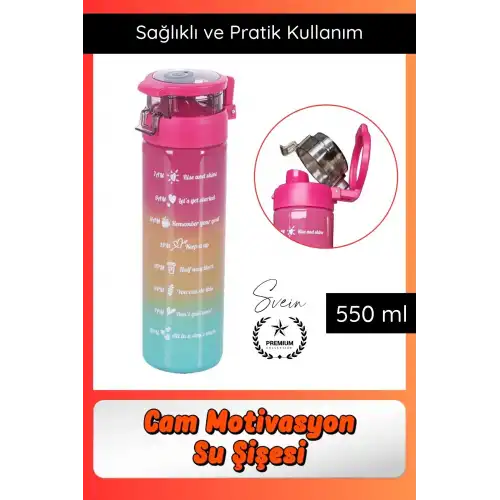 Günlük su tüketiminizi artırmak ve gün boyu motivasyonunuzu korumak için tasarlanan 550 ml cam motivasyon su şişesi; ölçülü yapısı ve şık tasarımı ile hem çocuklar hem yetişkinler için ideal bir kullanım sunar. Sızdırmaz kapaklı yapısı sayesinde güvenle taşınabilir.