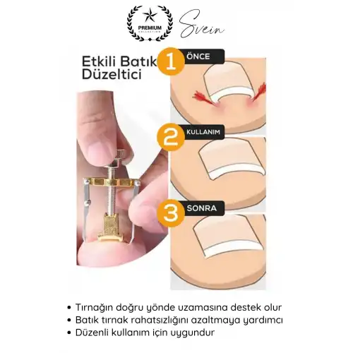 Batık ayak tırnağı sorunlarında pratik kullanım sunan ayak tırnağı batma düzeltici aparat; tırnağın doğal formuna dönmesine yardımcı olmak için tasarlanmıştır. Evde kolay kullanım sağlayan bu bakım aleti, tekrar kullanılabilir yapısı ile düzenli tırnak bakımına destek olur.